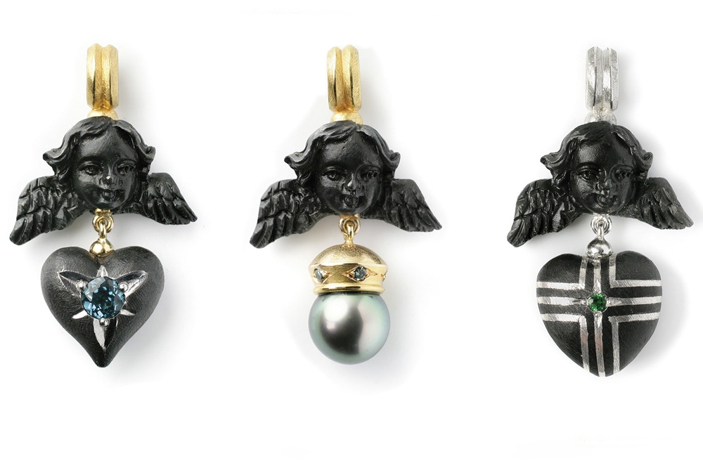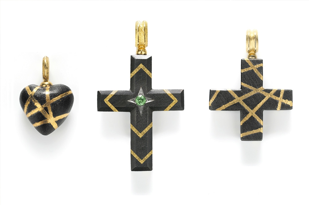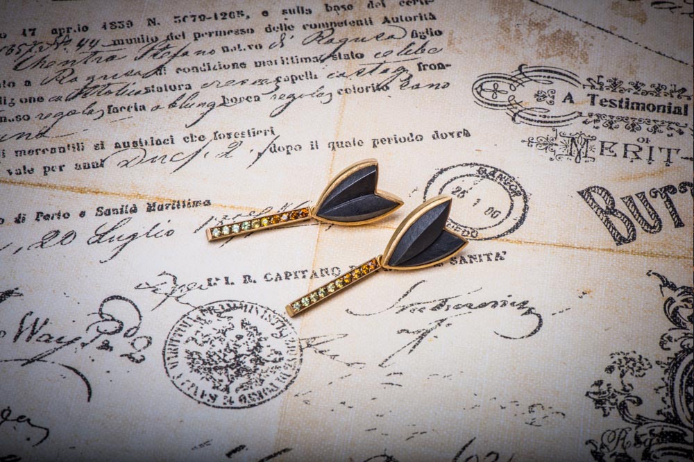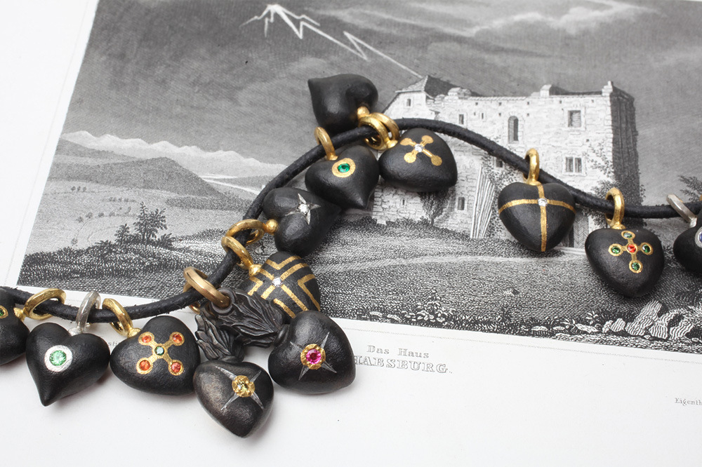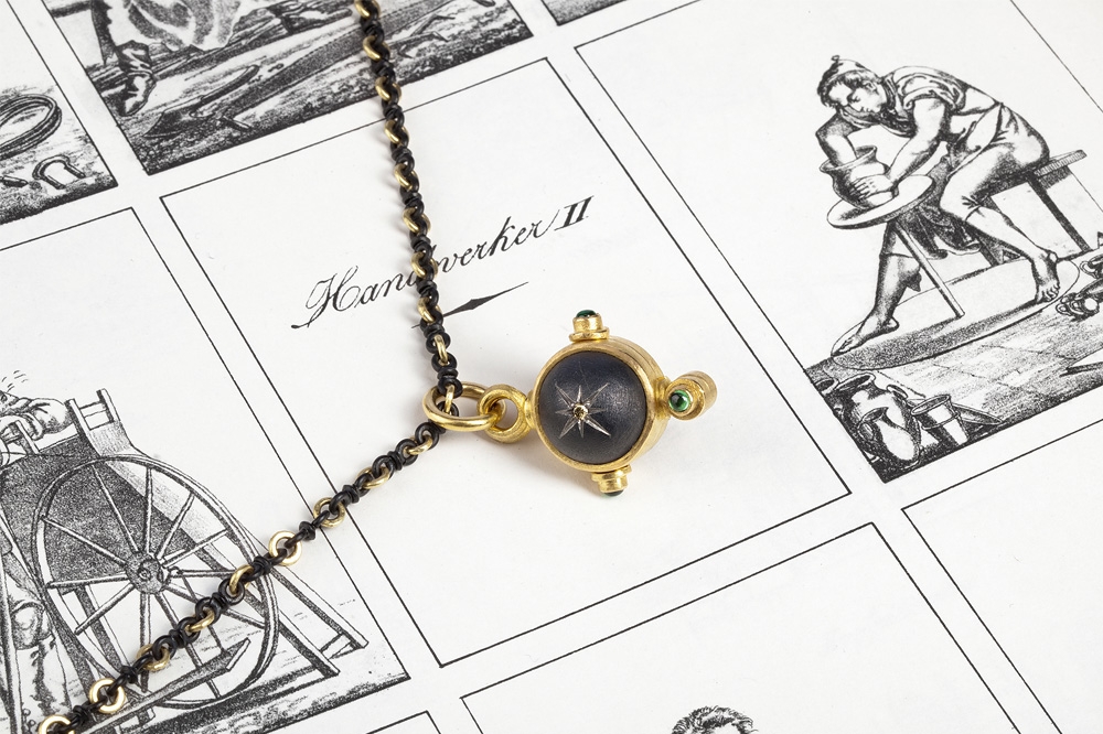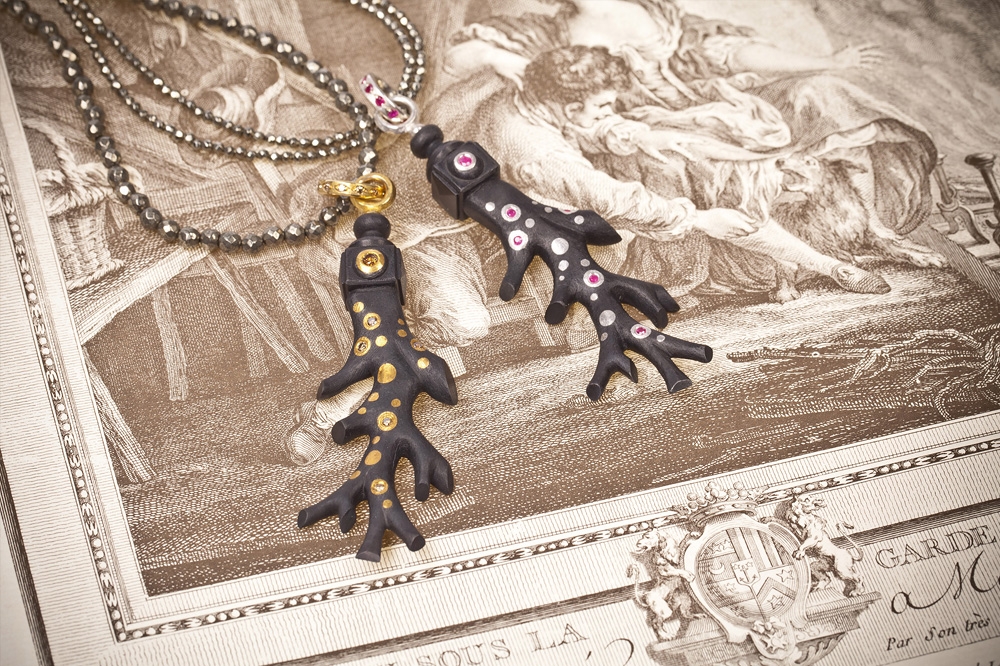 Überraschenderweise findet sich Eisen auch an Ohrschmuck und Colliers in der Kollektion Ferrum von Steffen Lang. Gerade hier spielt der Gestalter mit dem Gegensatz von schwer und leicht: zarte, eiserne Rosen als Ohrstecker oder auf eine Goldkette aufgefädelt scheinen die Gesetze der Schwerkraft ausser Kraft zu setzen. Farbsteine glänzen durch ihren sehr dezenten Einsatz und dienen eher der gestalterischerischen Akzentuierung und weniger als Hauptattraktion.