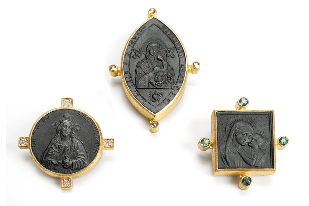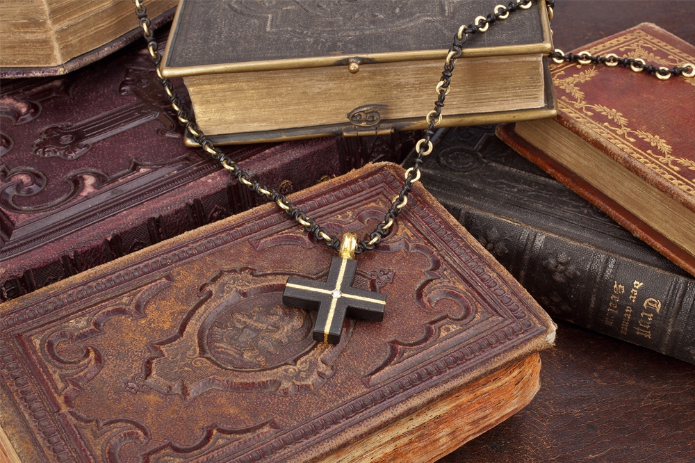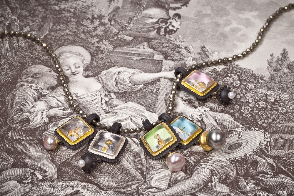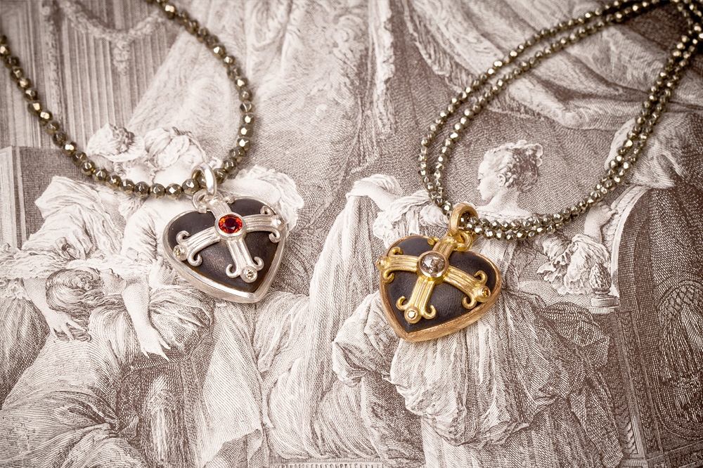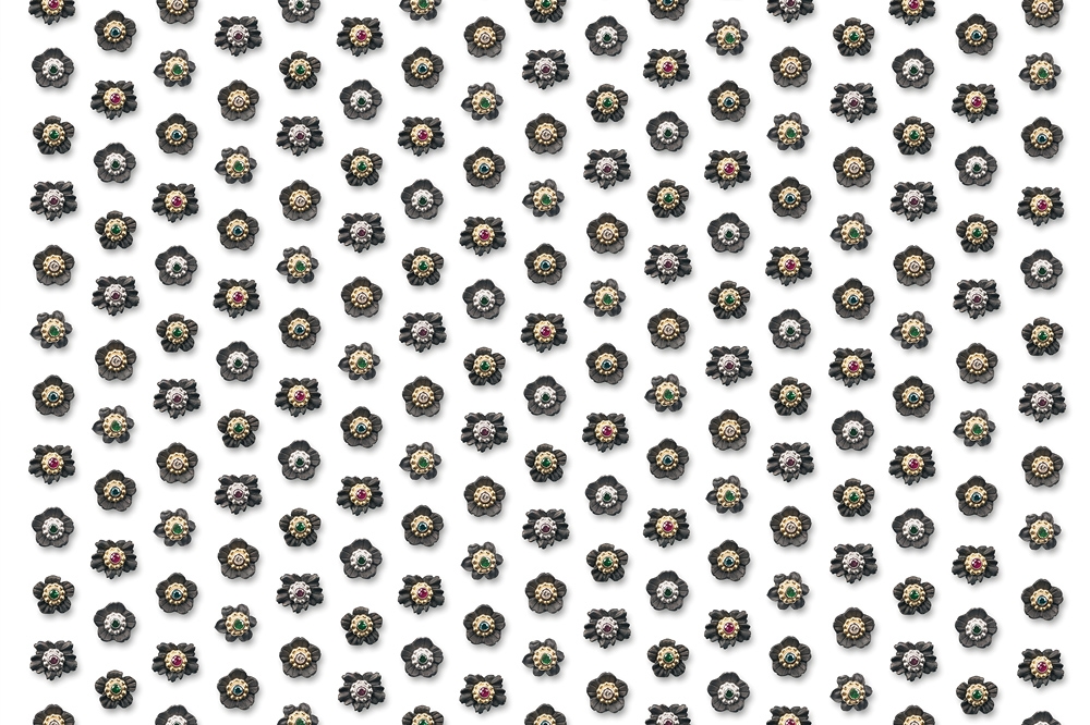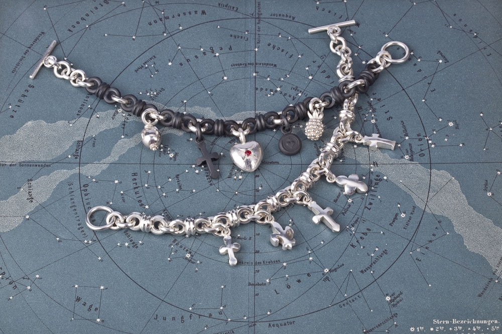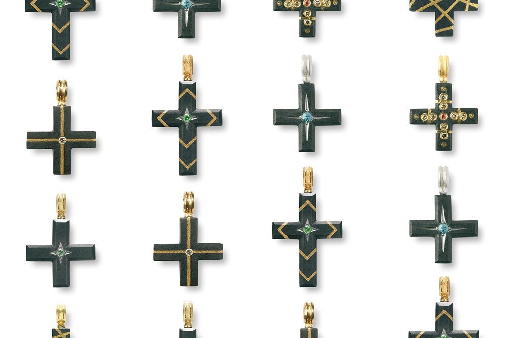 Überraschenderweise findet sich Eisen auch an Ohrschmuck und Colliers in der Kollektion Ferrum von Steffen Lang. Gerade hier spielt der Gestalter mit dem Gegensatz von schwer und leicht: zarte, eiserne Rosen als Ohrstecker oder auf eine Goldkette aufgefädelt scheinen die Gesetze der Schwerkraft ausser Kraft zu setzen. Farbsteine glänzen durch ihren sehr dezenten Einsatz und dienen eher der gestalterischerischen Akzentuierung und weniger als Hauptattraktion.