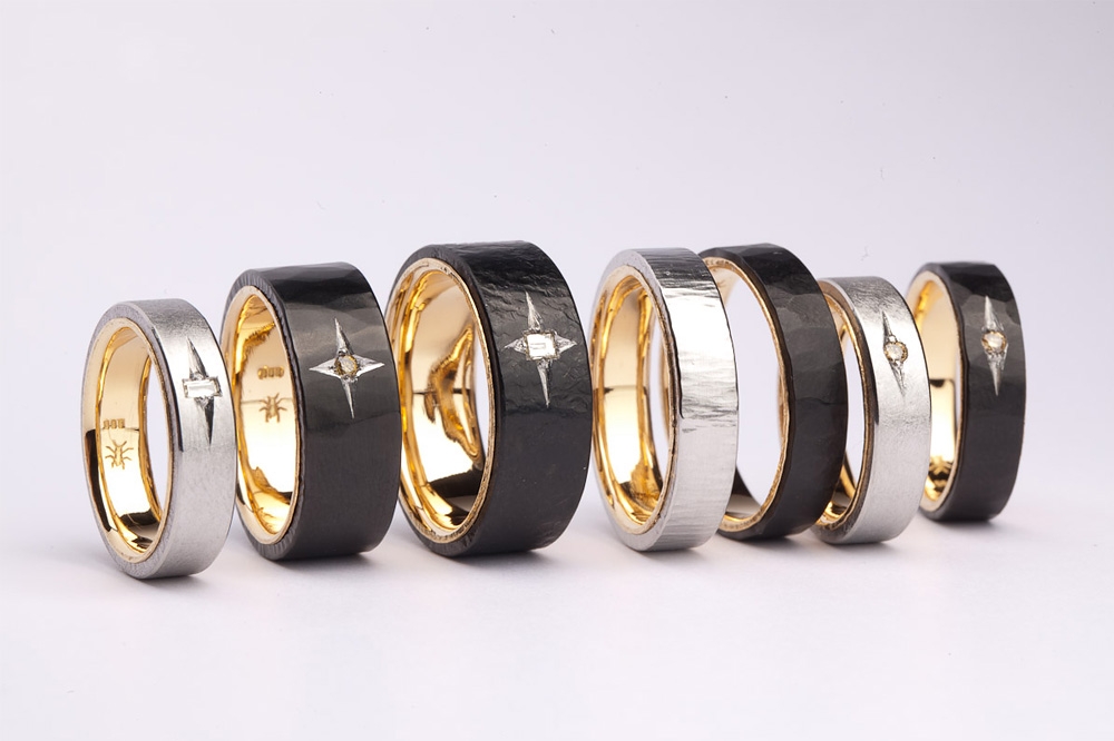 Über die traditionelle Technik des Tauschierens (die früher häufig in der Waffenherstellung Verwendung fand) hat Steffen Lang seine besondere Liebe zum archaischen Material Eisen entdeckt. Besonders die Farbkontraste, die sich durch die Kombination von Eisen und Edelmetallen ergeben, üben eine starke Faszination aus. Hervorgehoben werden diese Gegensätze durch die Technik des Brünierens. Mittels der Verwendung von Ölen und der Erhitzung des Eisens entsteht eine schwarze Färbung, die ursprünglich als Schutz gegen Korrosion diente. In der Kollektion Ferrum wird dieser Effekt auch als Gestaltungsmerkmal genutzt, welches einem Großteil der Schmuckstücke zugrunde liegt. Die großformatigen schwarzen Eisenringe dienen als Träger für die markante Oberflächengestaltung. Trotz des Materials und der Größe wird der Tragekomfort durch die polierten Innenflächen aus Gold- oder Silber immer gewahrt.