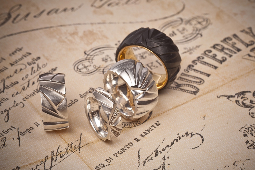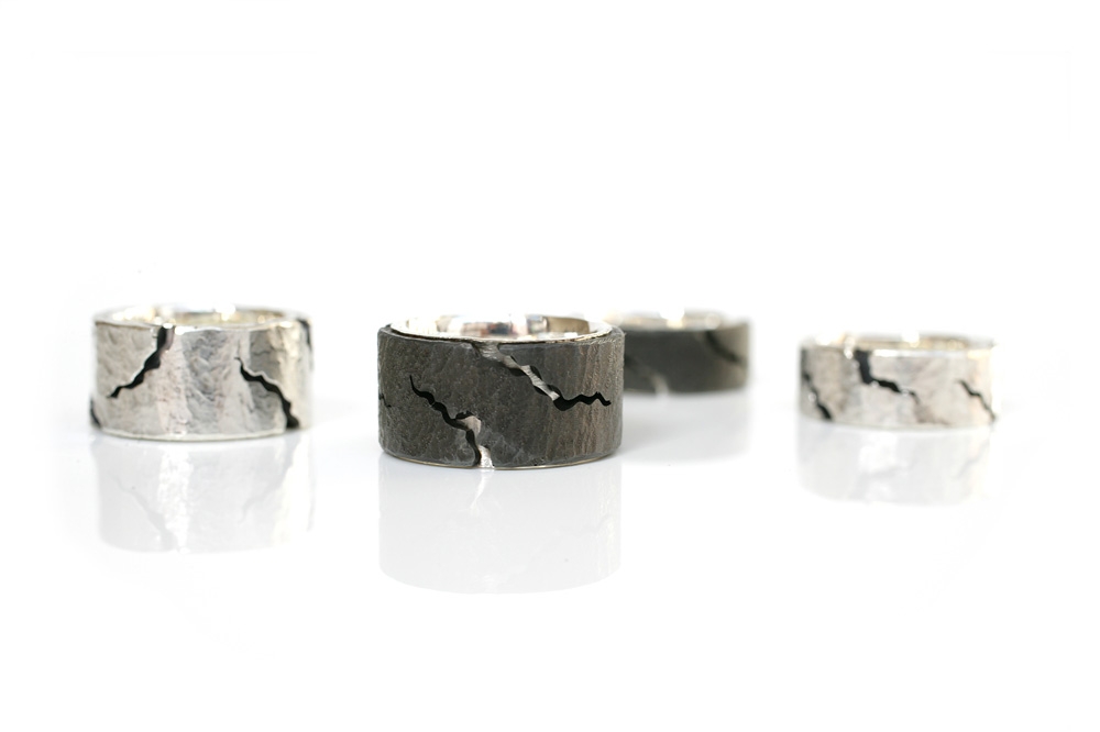 Ein ganz besonderer Akzent der Kollektion sind seine „Rissringe“. Während seiner Ausbildung zum Goldschmiedemeister an der Staatlichen Zeichenakademie in Hanau experimentierte Steffen Lang mit farbigem Lehm. Er fand heraus, dass die durch den Trocknungsprozess entstehenden Risse in Lehm bis zu einem gewissen Maße beeinflusst werden können. Die „Rissringe“ aus Eisen, Gold und Silber sind eine Fortführung dieses Themas.